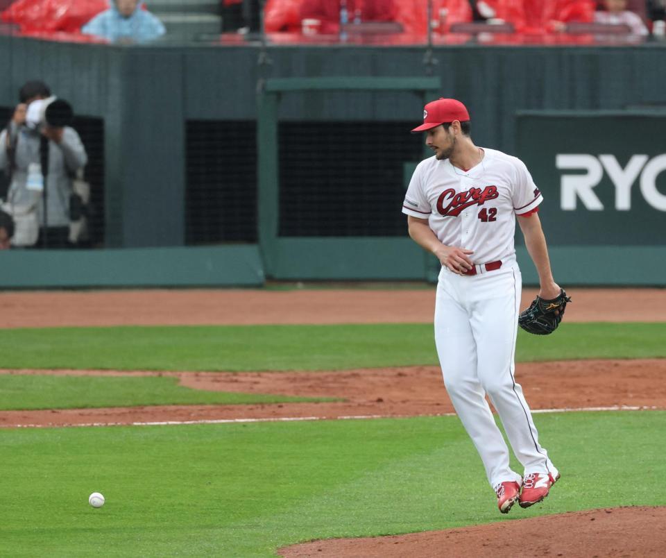 広島の先発・ターノックは、無死一・二塁の場面で信じがたいアクシデントに見舞われる。