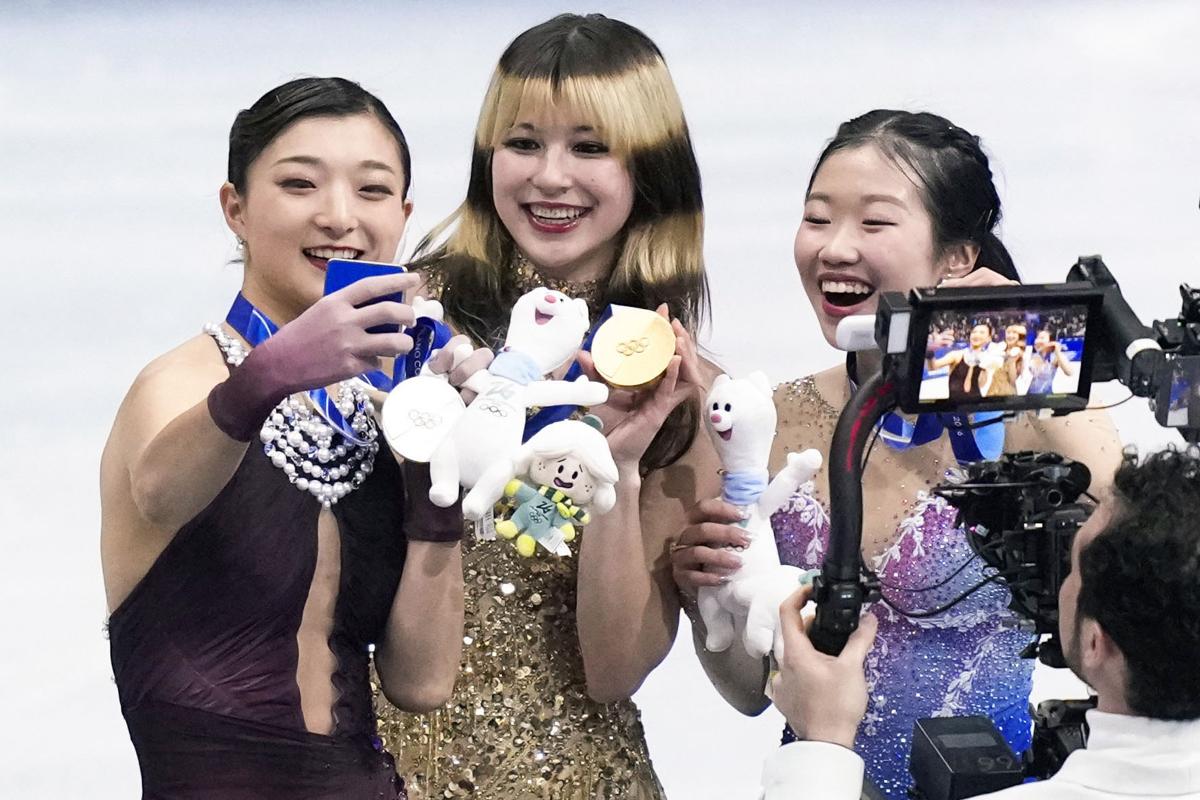 フィギュアスケート女子の表彰式でも、坂本花織が金メダルのアリサ・リュウ、銅メダルの中井亜美と3人でこの特別仕様スマホを使った自撮りを楽しむ姿が注目を集めていました。
